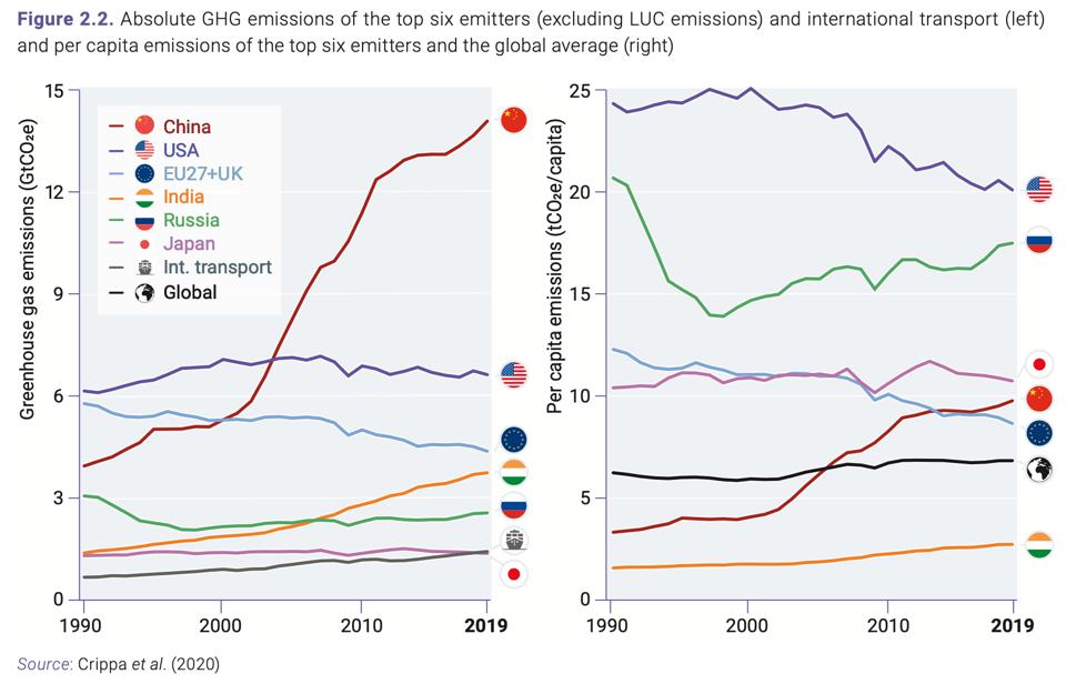 “The United States of America emits 13 per cent of global GHG emissions.” Comparatively, “China emits more than one-quarter of global GHG emissions.” The U.S. still contributes the most greenhouse gas emissions per capita in the world, but, over the last decade, the country’s GHG emissions have been in decline (0.4 per cent per year). “Greenhouse gas emissions per capita in the U.S. are dropping precipitously while those of China, India and Russia continue to rise. With the world’s most successful economy (over $21 trillion in 2019), it is not a surprise that the U.S. pollutes more per person, but the U.S. is making great strides in changing this.”