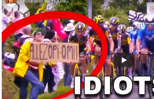 Granted, the self- absorbed idiot woman who caused the pile up and injured dozens of pro cyclists at the Tour the France did not hold a sign spouting woke socialist propaganda. But to the apparent contrary, “go grandpa and grandma” seems almost cute and old-fashioned. Nevertheless, it is noteworthy that she caused the havoc not because she was a too enthusiastic fan of any cyclist, but by holding the sign that has nothing to do with cycling into the cameras, not even to be seen by the athletes (and obviously, her grandma wasn’t racing). Traditionally, the morons who ruin bike races are all men, but they usually stand in the way to take pictures of the athletes or cheer them on or have some other illusion that their presence would matter to any one.