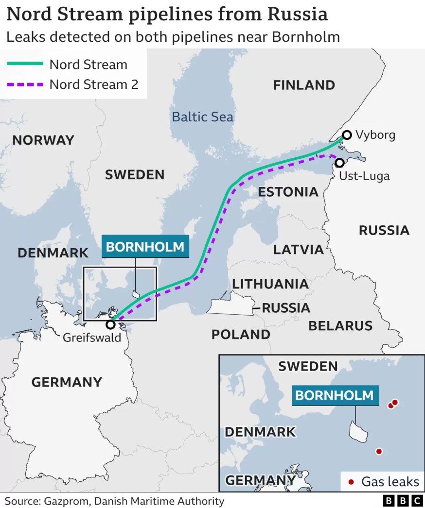 Denmark and Sweden reported gas leaks in the Nord Stream 1 and 2 pipelines earlier this week, raising the possibility of a deliberate attack.
