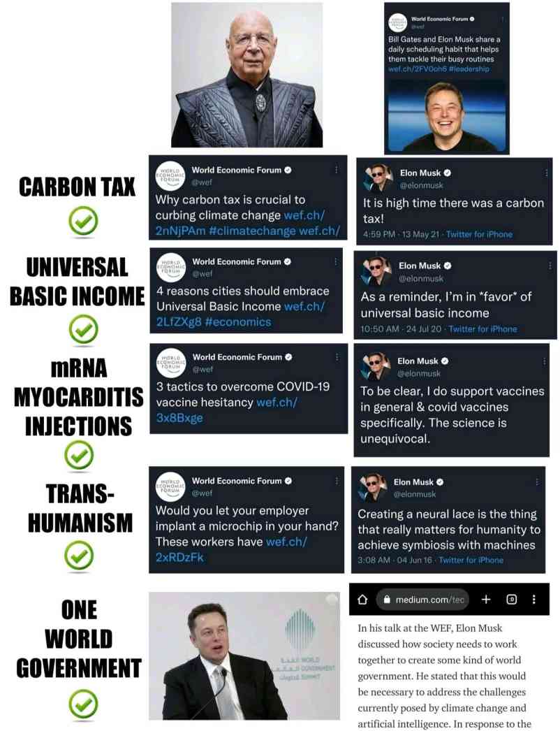 I took time to verify that Musk actually tweeted the statements below and found references to each one. Why would Musk be so aligned with the Schwab and the WEF? Because “birds of a feather flock together.”