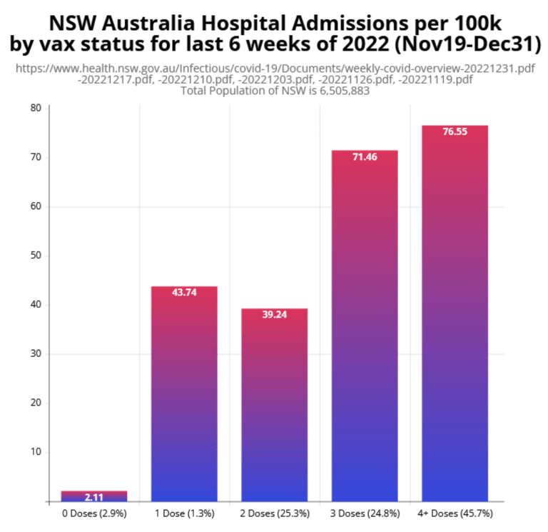The population of NSW in Australia is 6½ million people. They are a highly vaccinated group. Looking at the Australian Government data for the last 6 weeks of 2022 we see that.