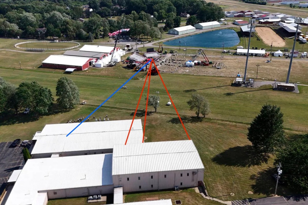 - 5 windows had a line of site on Trump, window 5 and 6 from the left had a line of site unobstructed by the closest tree or the red harvester next to the bleachers.