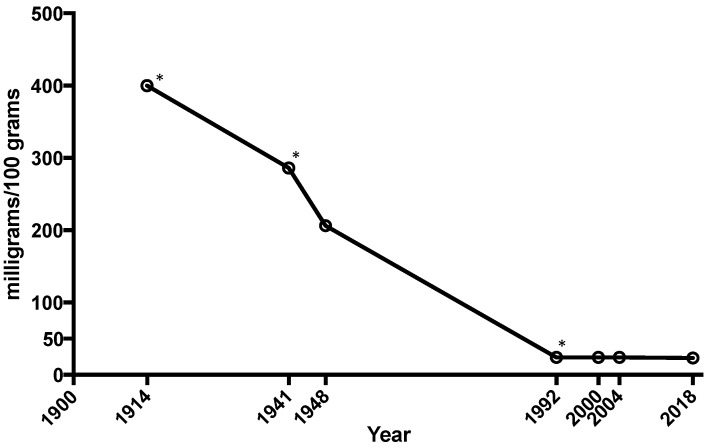 For other foods: “It is important to note that the USDA mineral content of vegetables and fruits has not been updated since 2000.“ [14]