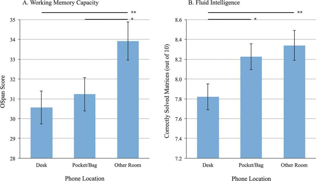 – When people have their phone in their pocket or on the table, they do worse on cognitive tests than when their phone is left in the next room.